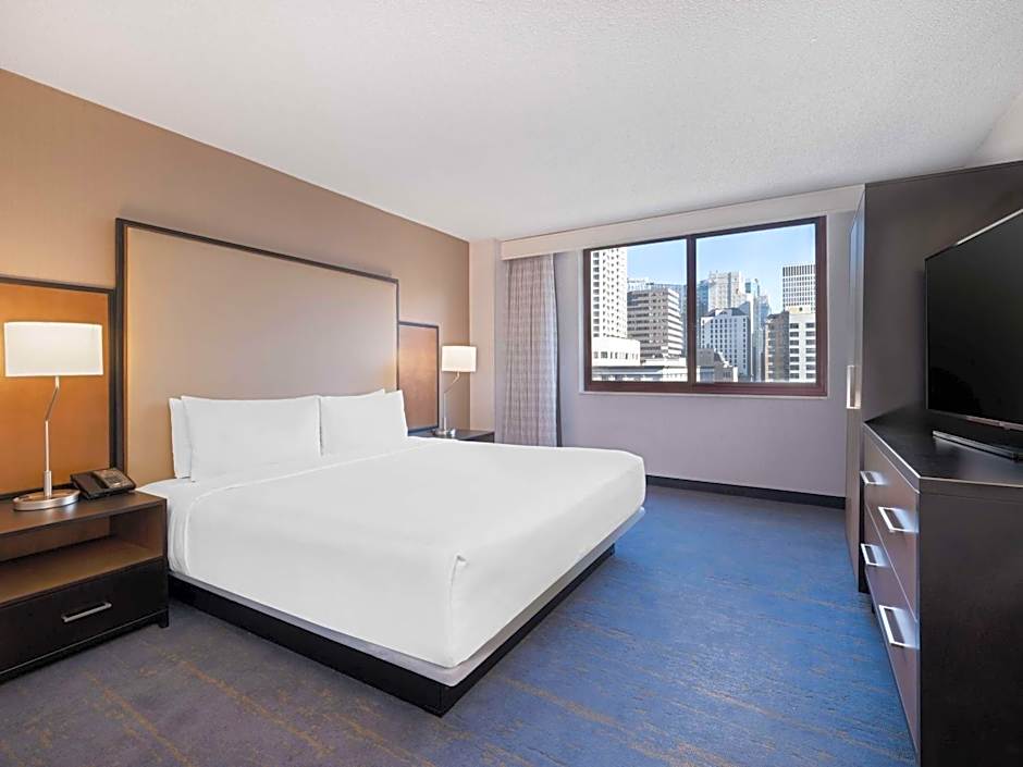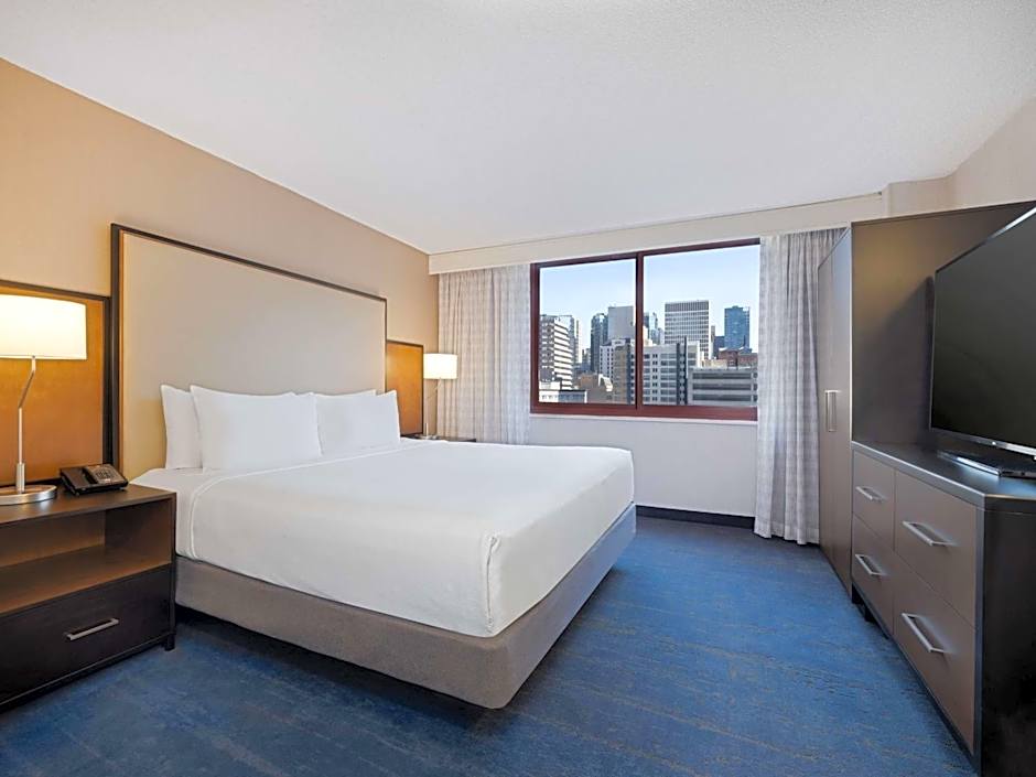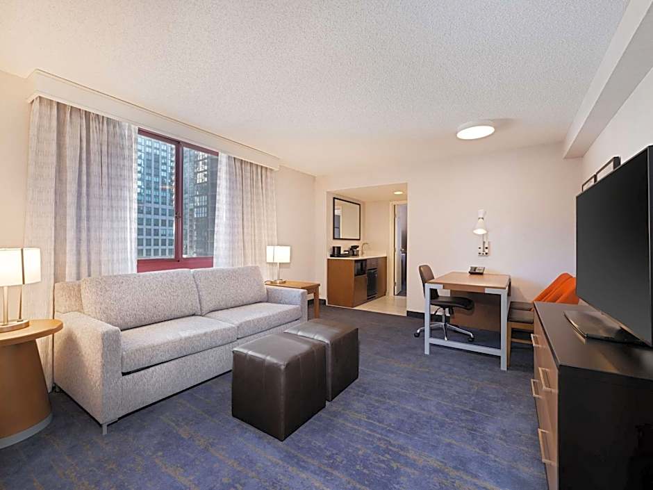 Features panoramic views of River North entertainment area and State Street as well as a sofa bed.